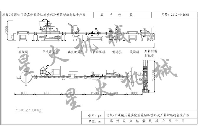 理瓶2頭灌裝真空旋蓋貼標(biāo)噴碼收瓶及開箱封箱打包生產(chǎn)線