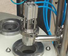 ○ 該灌裝生產(chǎn)線具有六個同步注脂灌裝頭,油脂可均勻地被擠壓灌裝到容器里。
