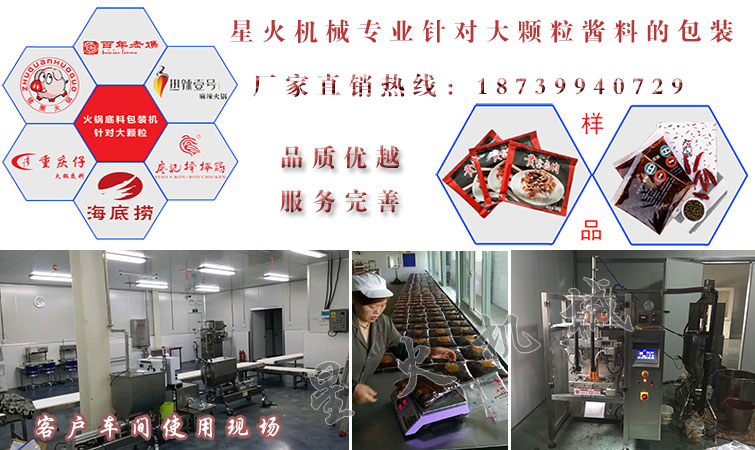 醬料包裝機系列是星火機械力推的一系列包裝設備,也是銷售量較好的機械設備,該系列包裝機主要對顆粒醬料及粘稠醬料進行包裝,如:火鍋底料、豆豉醬、辣椒醬、牛肉醬等各種調(diào)料的包裝,目前我司已經(jīng)與很多知名醬料企業(yè)合作,歡迎廣大新老客戶前來我司考察監(jiān)督。下面幾款醬料設備就是星火賣的比較好的幾款醬料包裝機產(chǎn)品。