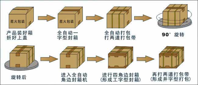 本包裝生產(chǎn)流水線主要操作流程:已裝好產(chǎn)品折好上蓋的產(chǎn)品箱從左邊的滾筒進入此流水線,進入第1臺包裝機械:全自動一字型封箱機(進行一字型封箱)—→進入第二臺包裝機械:全自動打包機(打兩道打包帶)—→進入第三臺包裝機械:90°旋轉機—→進入第四臺包裝機械:全自動角邊封箱機(進入四角邊封箱,形成工字型封箱)—→進入較后的第五臺包裝機械:全自動打包機(打另外兩道的打包帶,形成井字形打包)—→工字型封箱+井字型打包完成。